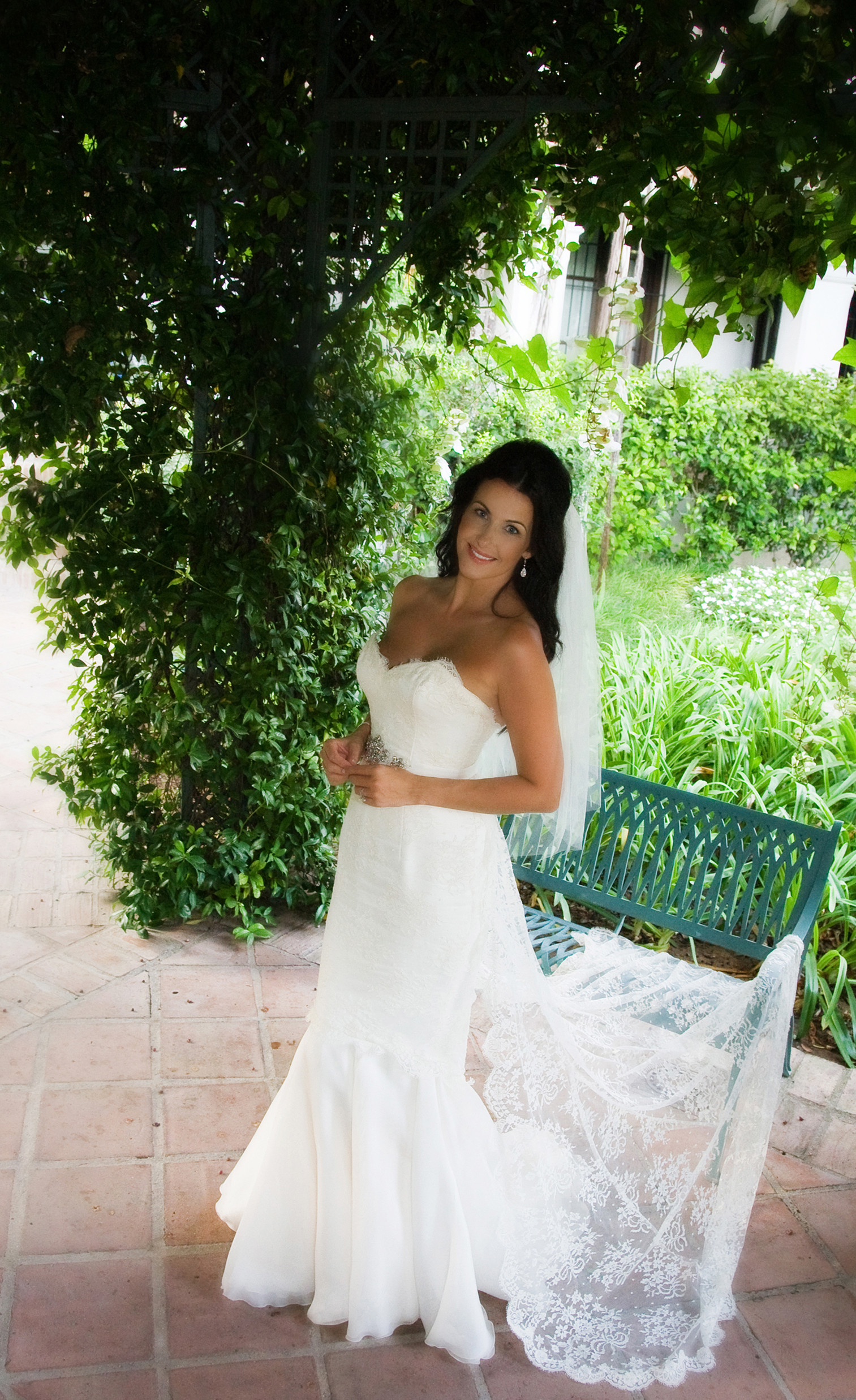 Julie’s dress was designed specially for her in French Chantilly lace and satin faced silk organza. The lace train is detachable and the belt is encrusted with crystals and pearls. Her short veil has 4 layers of tulle.